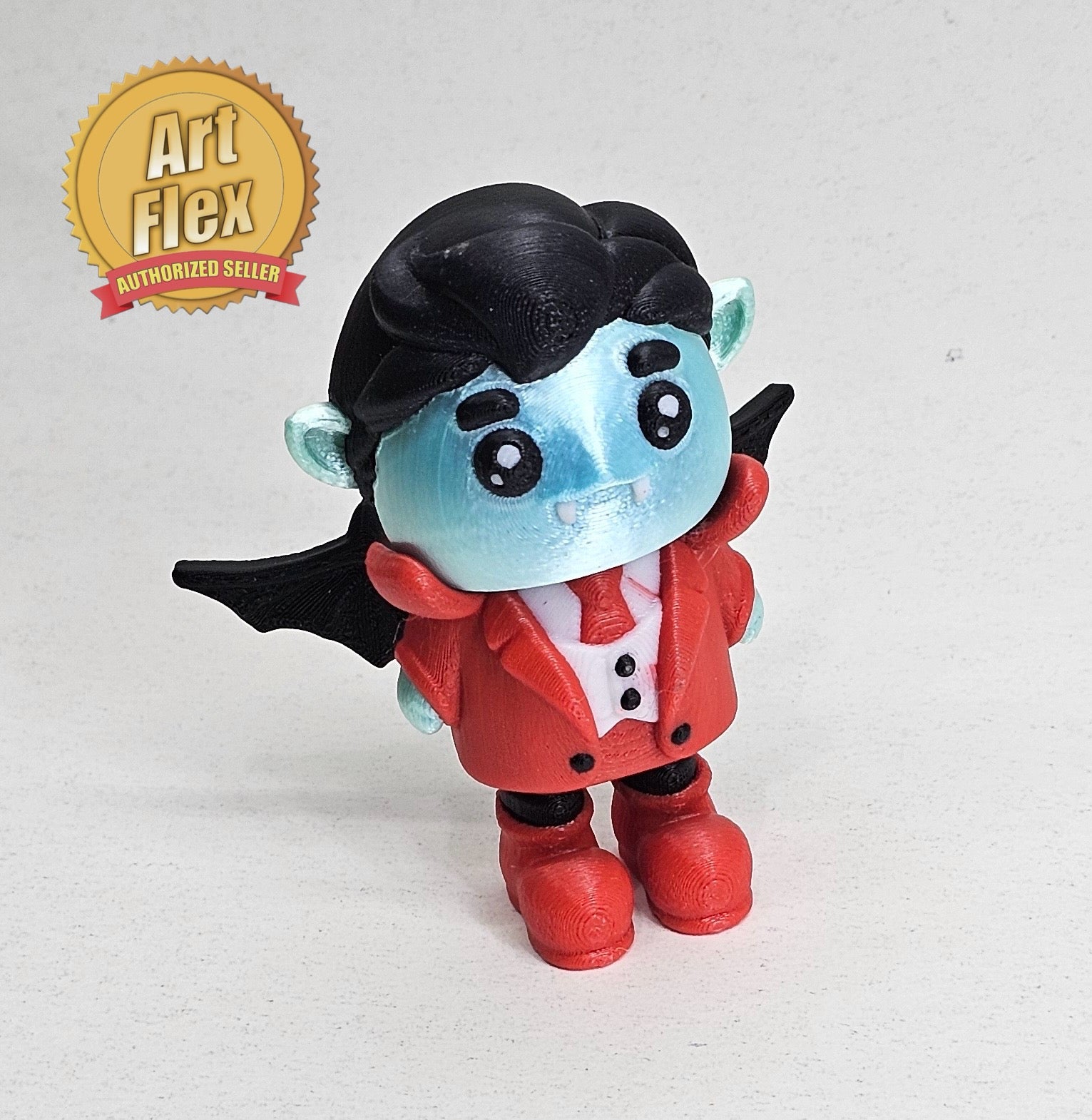 3d Print, multicolor Dracula, designed by ArtFlex. 🧛 Introducing the Little Flexi Dracula by ArtFlex! 🧛Bring home a charming twist on a classic character with this delightful 3D printed Dracula! Charming Design:** This playful figure features a vibrant color scheme, with a striking red cape and boots paired with a whimsical blue skin tone, capturing Dracula's essence in a fun and approachable way. Expressive Face:** With big, friendly eyes and a cheeky grin, this Dracula is sure to bring a smile to anyone's face. Quality Craftsmanship:** Expertly printed with attention to detail, this collectible is perfect for display or as a quirky gift for fans of all things spooky. Perfect For: Collectors of unique 3D prints Halloween enthusiasts or anyone who loves vampires with a playful twist Gift-givers looking for a fun and memorable present 🎉 Get Yours Today! Don’t miss out on this enchanting Dracula figure! With limited availability, be sure to secure yours before they're gone!